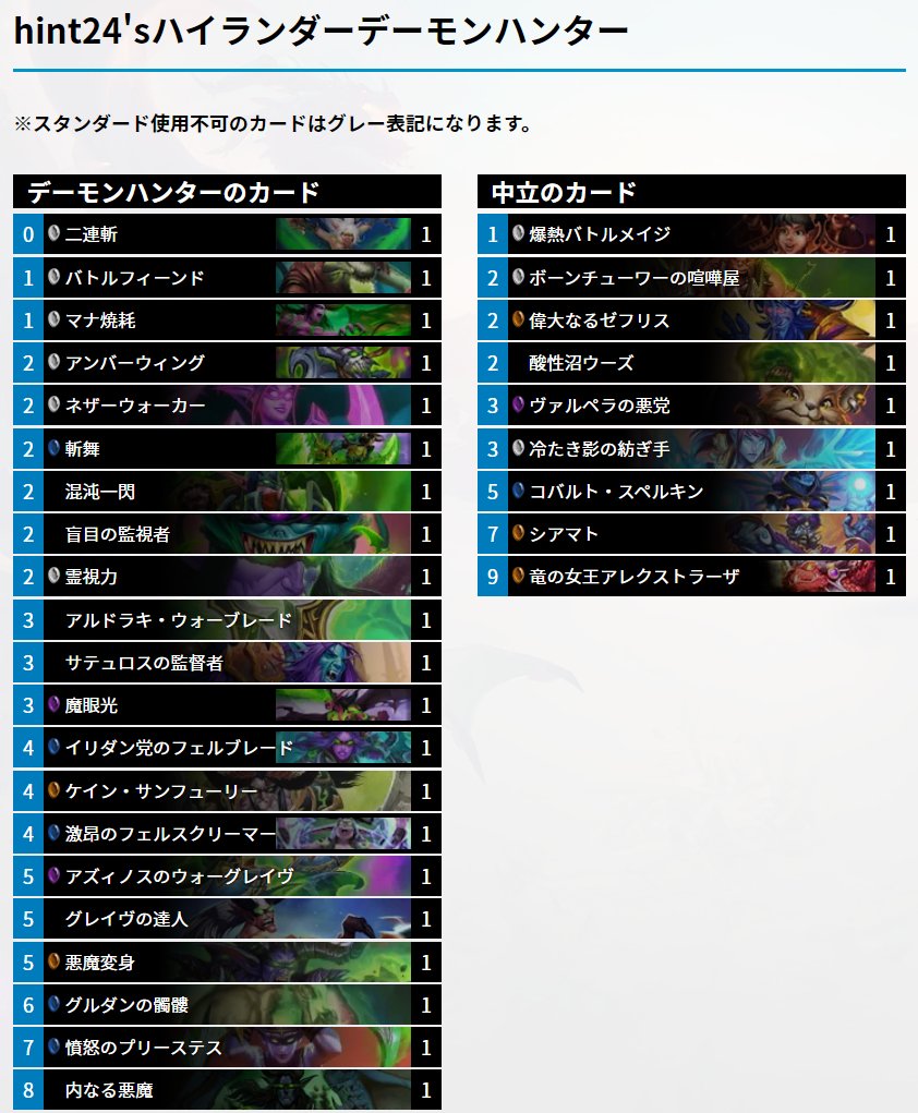 Ahirun On Twitter Pavelingbook Hs がレジェンド10位を獲得したハイランダーデーモンハンター 以前より使用していたリストを変え 守備寄りのカードの多くを攻めるカードに変更 カード単体のバリューが高い コイルファングの将軍を新たに採用しています Hs Dh