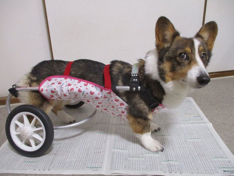 車イスに泥よけエプロン カッパ コーギーのレディは名前負け