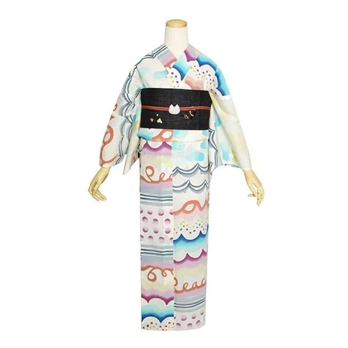 Amazon 京都きもの町 女性 浴衣 白色 猫波 猫ドット段模様