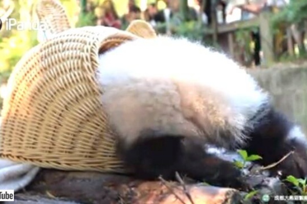 じたばたおしりがこれまたキュートな子パンダちゃん 籠に頭を突っ込ん
