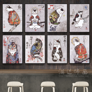 纹身店装饰画日本武士猫个性刺青猫有框挂画宿舍墙壁贴画复古海报 阿里