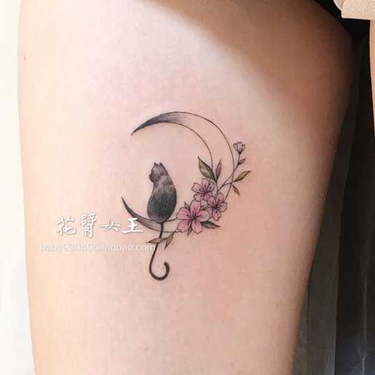 宜春美容师的newschool大腿外侧猫玫瑰花纹身刺青图案